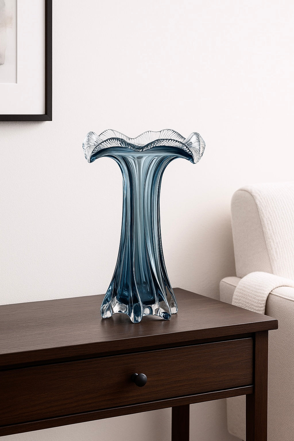 Graceful and striking, the Marina Crest Glass Vase captures the fluid beauty of flowing water. Handcrafted in deep oceanic blue crystal with clear ruffled rims, this vase evokes a sense of movement and artistry, transforming any space into a gallery of elegance.