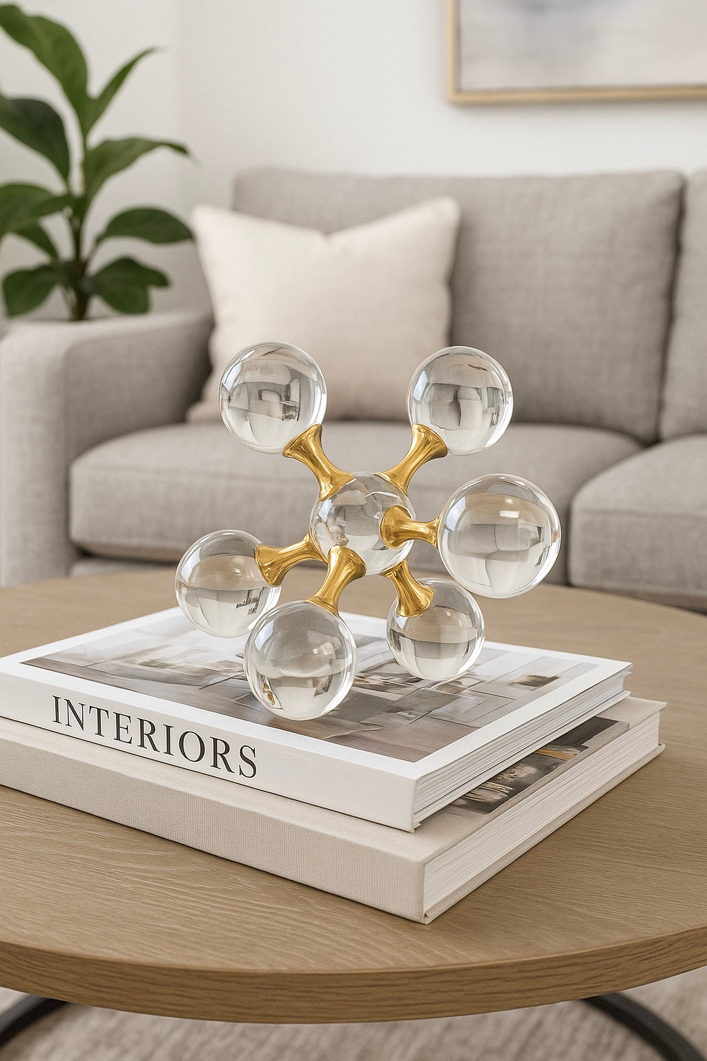 The Nexus Crystal Orb Sculpture embodies the perfect fusion of art, geometry, and light — a modern masterpiece that commands attention through its elegant symmetry and radiant detailing. Crafted with clear crystal spheres anchored by a polished gold metal framework, this piece captures the essence of balance and sophistication.