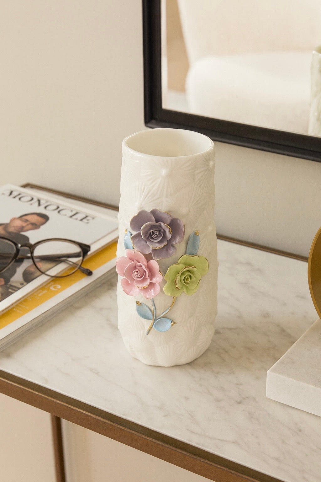 The Fleur Amora Ceramic Vase is a poetic celebration of elegance and artistry — where delicate florals bloom against a canvas of pristine white ceramic. Adorned with beautifully sculpted 3D flowers in soothing pastel tones, each petal is intricately detailed with a soft gloss finish and subtle gold accents, creating a timeless piece that embodies charm and femininity.